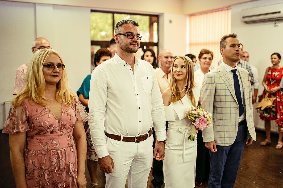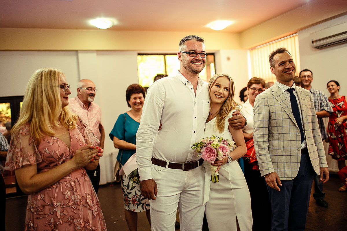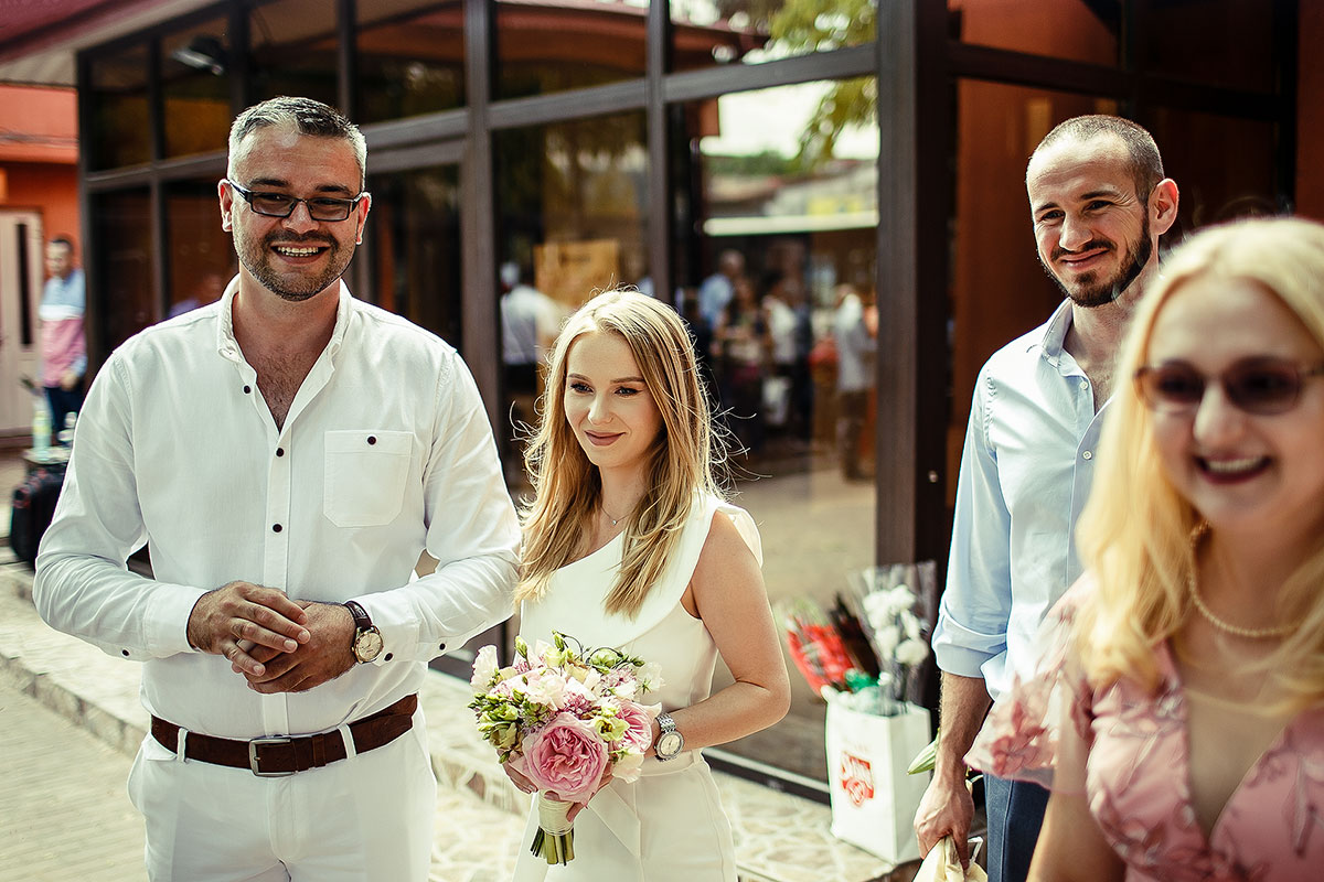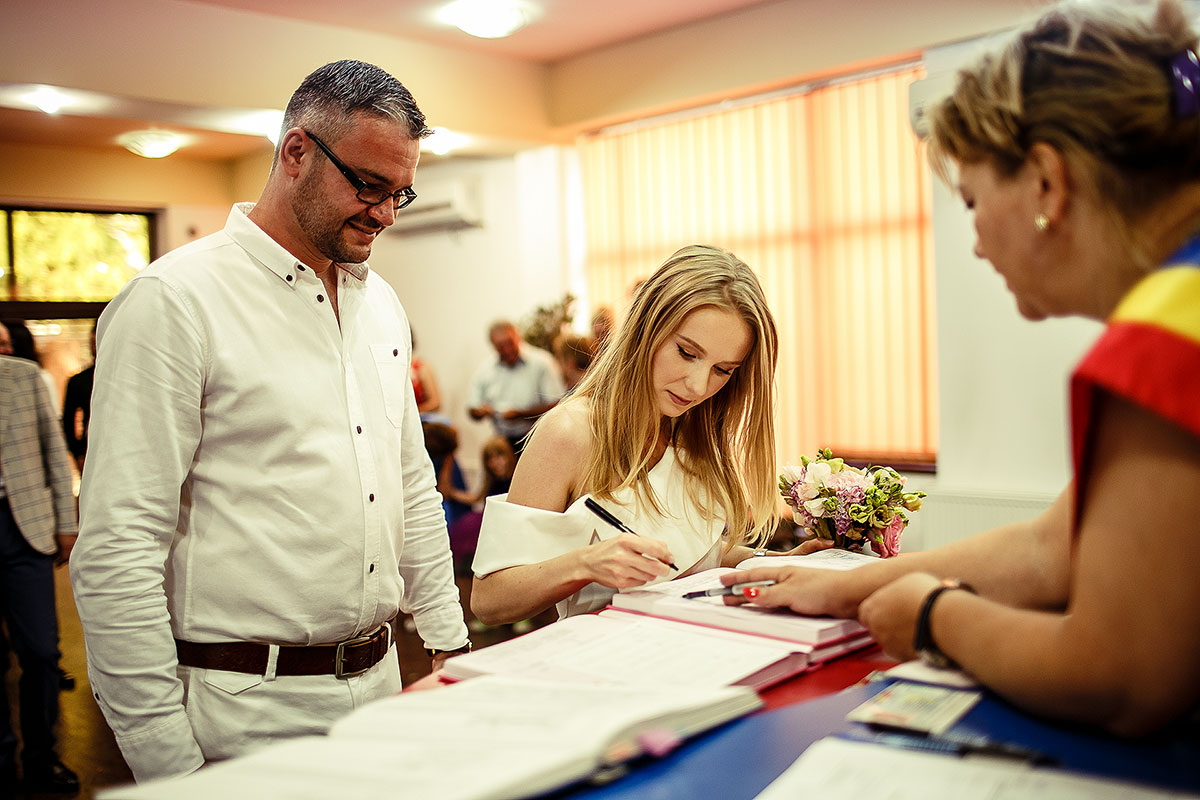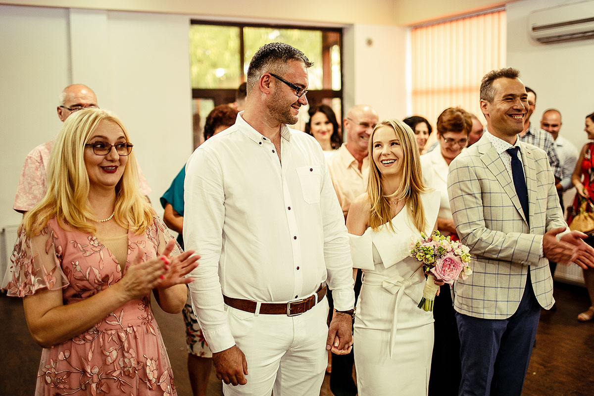 Acum a venit momentul fotografiilor de cununie civilă. Îmbrăcați impecabil în alb, cu sufletele curate și zâmbetul pe buze, cei doi au încântat pe toată lumea. Un pas important în unirea a două destine, pe care l-au făcut cu eleganță și strălucire.