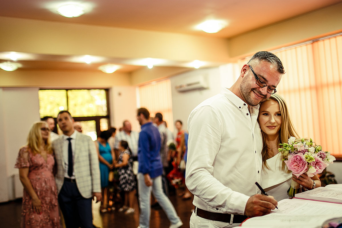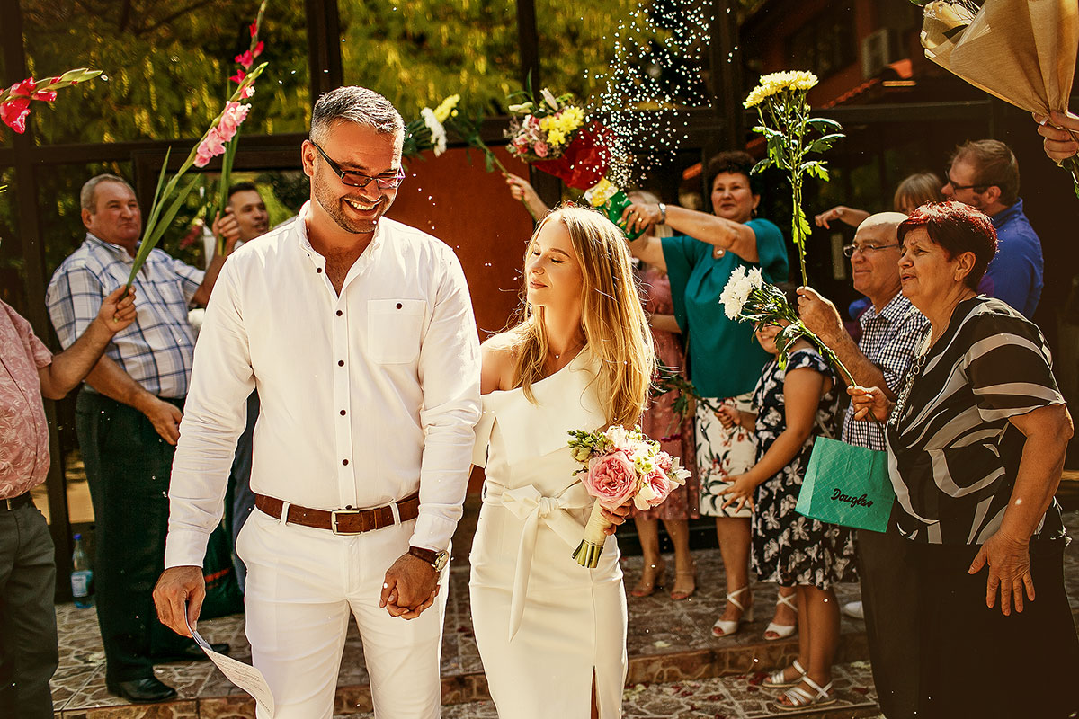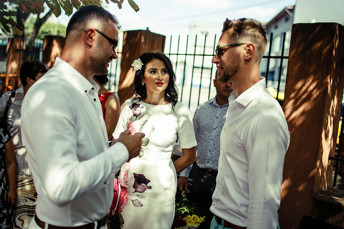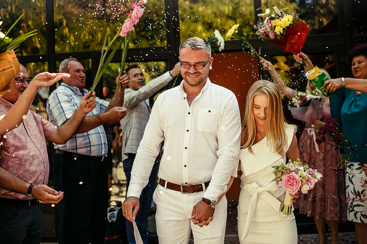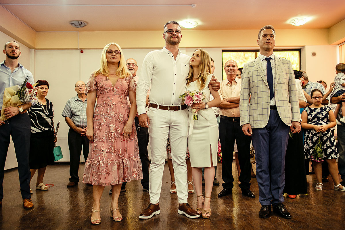 Acum a venit momentul fotografiilor de cununie civilă. Îmbrăcați impecabil în alb, cu sufletele curate și zâmbetul pe buze, cei doi au încântat pe toată lumea. Un pas important în unirea a două destine, pe care l-au făcut cu eleganță și strălucire.